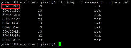 먼저 명령어 ret의 주소를 찾아야 하는데 objdump 명령어로 쉽게 찾을 수 있다. [사진 5]에서 확인할 수 있는 모든 ret 명령어의 주소를 사용할 수 있다. 여기선 0x08048336 주소를 사용한다.