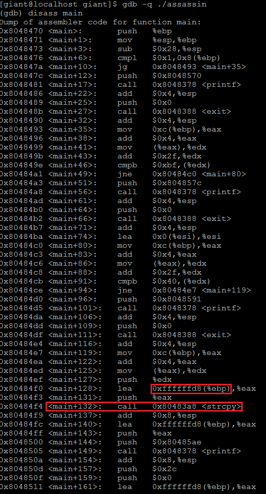 먼저 main 함수의 어셈블리어 코드를 보면 strcpy 함수를 호출하기 전에 ebp-0x28 주소를 eax 레지스터에 저장한다. 즉, 이 곳이 buffer 변수의 시작점이다.
