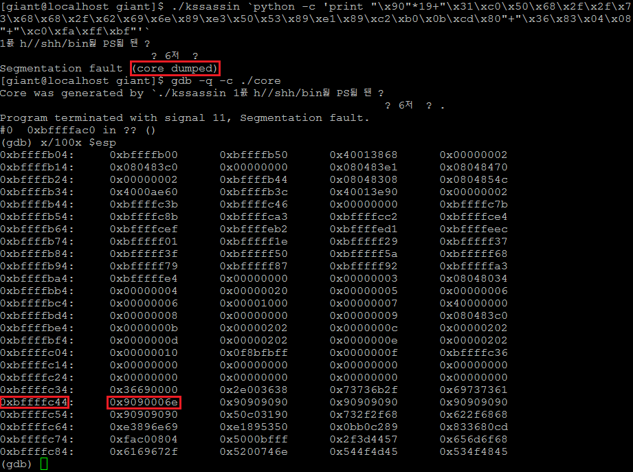 하지만 공격이 성공하지 않고 core 파일이 생성되었다. core 파일을 gdb로 실행하여 확인해보면 실제 buffer 변수의 주소가 0xbffffc46이다. 이유는 gdb를 통해 실행하면 gdb 환경변수 등과 같은 이유로 실제 주소와 차이날 수 있다.