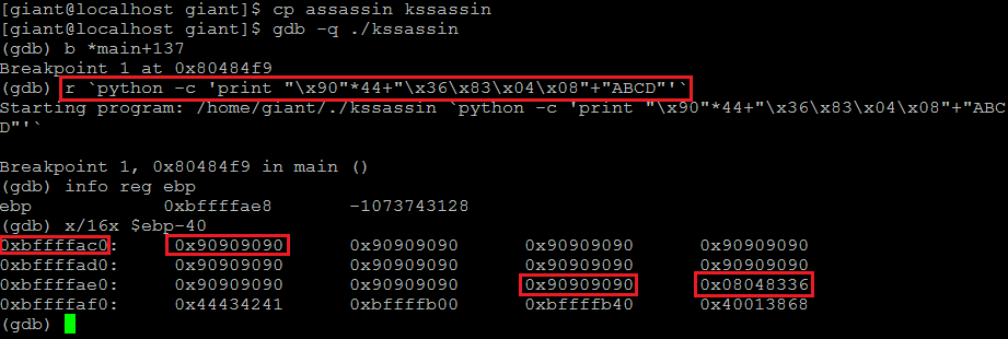 디버깅하기 위해 assassin 파일을 다른 이름(kssassin)으로 복사해준다. 입력 값으로 임의의 값 "\x90" 44bytes와 명령어 ret의 주소로 ret 지점까지 변조하고 ebp+8 지점은 문자열 "ABCD"를 넣었다.