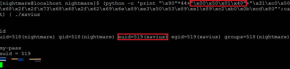 따라서 위와 같이 임의의 값 "\x90" 44bytes와 표준 입력 값이 저장되는 "\x00\x50\x01\x40" 값으로 ret를 변조한다. 그리고 shellcode 25bytes를 입력하면 xavius 계정의 password를 확인할 수 있다. 사용한 shellcode는 다음과 같다.