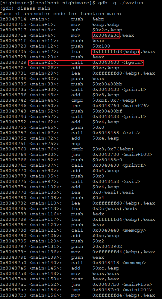먼저 main 함수의 어셈블리어 코드를 보면 fgets 함수를 호출하기 전에 ebp-0x28 주소를 eax 레지스터에 저장한다. 즉, 이 곳이 buffer 변수의 시작점이다. 그리고 stdin 표준 입력 버퍼의 주소는 0x08049a3c임을 알 수 있다.