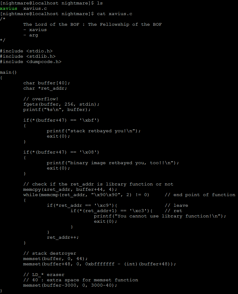 주어진 코드를 보면 스택, 바이너리, 라이브러리 영역을 사용할 수 없다. 그런데 이전 문제들과는 달리 buffer 변수 값을 argv 인자가 아닌 fgets 함수와 stdin 표준 입력을 이용하여 입력받는다. fgets 함수와 같이 표준 입력을 받는 함수들은 자신만의 임시 버퍼에 입력 값을 저장하고, 변수에 해당 값을 저장한다. 그리고 라이브러리 영역을 "\x40" 값이 아니라 "\x90" 값으로 제한하는 것으로 보아 stdin 입력 버퍼 공간인 0x40~ 주소를 이용하면 될 것 같다.