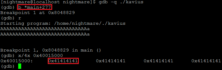 디버깅하기 위해 xavius 파일을 다른 이름(kavius)으로 복사하였다. 그리고 fgets 함수가 끝난 직후에 브레이크 포인트를 설정하고 실행하여 표준 입력으로 문자 "A"을 수십개 입력하였다.