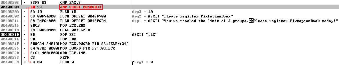 RETN 명령어까지 실행하여 메시지 박스를 호출하면 위와 같은 명령어들을 볼 수 있는데 CMP 명령어로 EAX 레지스터의 값과 0x3를 비교한 후 EAX 레지스터의 값이 작으면 0x00408B34 주소로 점프한다. 이 곳을 패치하면 된다.