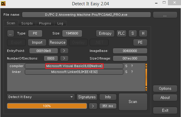 Detect It Easy 도구로 프로그램을 살펴보면 Visual Basic 언어로 만들어진 것을 확인할 수 있다.