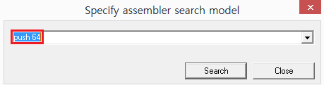 올리디버거로 movgear 프로그램을 메인 화면이 나올 때까지 실행한 뒤, code 섹션에서 우클릭 - Search for - Allcommands... 기능을 클릭하여 위와 같이 push 64 명령어를 검색해보자.