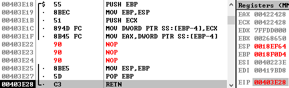 내부 함수를 보면 0x00403E22 주소의 MOV EAX, DWORD PTR SS:[EAX+2C] 명령어에 의해 EAX 레지스터의 값이 0x0 값으로 변경된다. 따라서 이 명령어를 패치하면 된다.