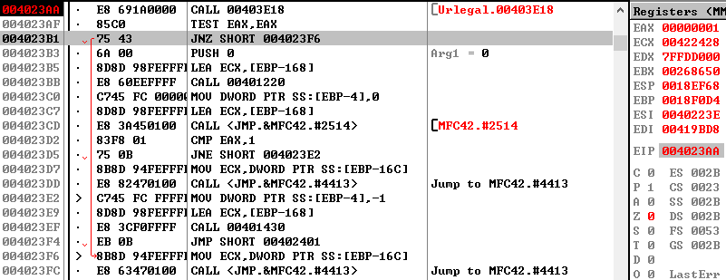리턴 주소를 살펴보면 0x004023BB 주소의 CALL 00401220 명령어에 의해 [사진 1-13]의 루틴이 호출되었음을 알 수 있다. 그리고 바로 위에 0x00403E18 함수를 호출하고 EAX 레지스터의 값에 따라 0x004023BB 명령어를 수행하지 않고 0x004023F6 주소로 점프하고 있다. 0x004023AA 주소에 브레이크 포인트를 설정하고 다시 프로그램을 실행하고 종료해보자.