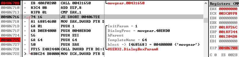 그럼 위와 같이 0x00406725 주소에 멈추게 된다. 이 함수가 [사진 2-7]에서 확인한 대화상자를 띄우는 함수이다.
