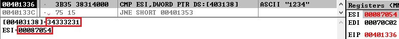 먼저 0x0040133C 주소의 JNE 명령어에 의해서 실패 메시지를 보여주는 메시지 박스 함수로 점프한다. JNE 명령어 직전에 CMP 명령어를 통해 ESI 레지스터의 값과 0x00403138 주소의 메모리 값을 비교하여 같은지 검사한다. 같지 않으면 0x00401353 주소로 점프하여 실패하는 것이다. 0x00403138 주소의 메모리 값을 보면 두 번째 입력한 값임을 알 수 있다.