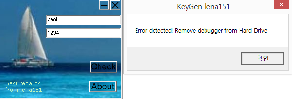 실패했을 때의 메시지는 위와 같은데 디버거를 하드에서 지우라고 한다. 안티디버깅 기법을 쓰는지 확인해야 한다.